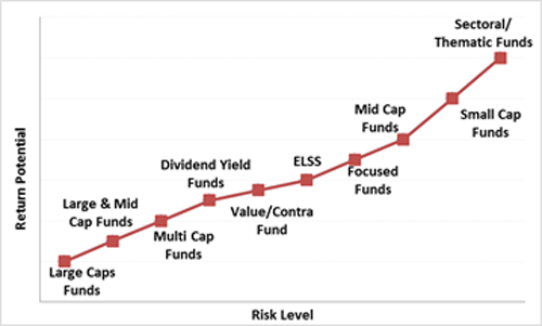 - Small Cap Funds -: These equity mutual funds will invest 65 percent of its assets in small-cap stocks. These schemes will invest in small-sized companies which may on may-not become big companies. Hence, these are extremely risky but can provide phenomenal returns too. To mitigate risk in small-cap funds, one should have an investment horizon of 5 years plus. Franklin India Smaller Companies Fund, HDFC Small Cap Fund Growth, L&T Emerging Businesses Fund-DP (G), Reliance Small Cap Fund, SBI Small Cap Fund – D (G) are some of the top 4 performing small cap schemes for SIP investments in India. The below graph shows the risk profile attached in various equity oriented schemes. This clearly tells that small-cap funds are riskiest asset class of equity mutual funds.